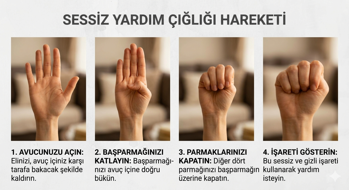 Şiddet failinin yanında olduğu için konuşamayan kişilerin, çevresine “tehlikedeyim, yardım edin” mesajı iletebilmesini sağlayan bu işaretin, dünya genelinde pek çok kişinin kurtarılmasına katkı sağladığı biliniyor. Peki, sessiz yardım işareti nedir, nasıl yapılır?